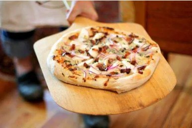 Add apple slices, bacon, onion and blue cheese. Top with a sprinkle of oregano and a drizzle of maple syrup.